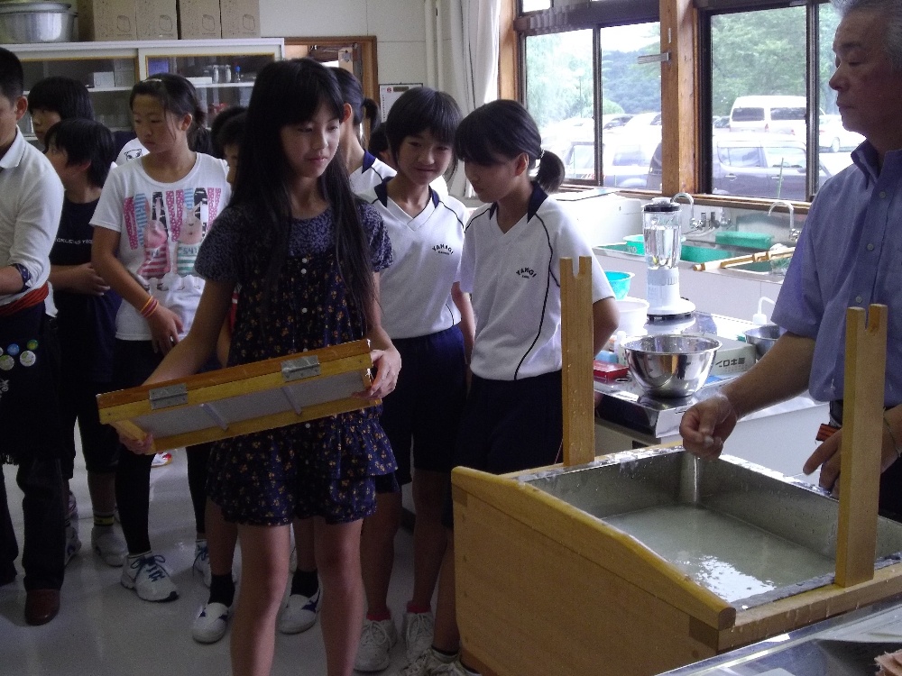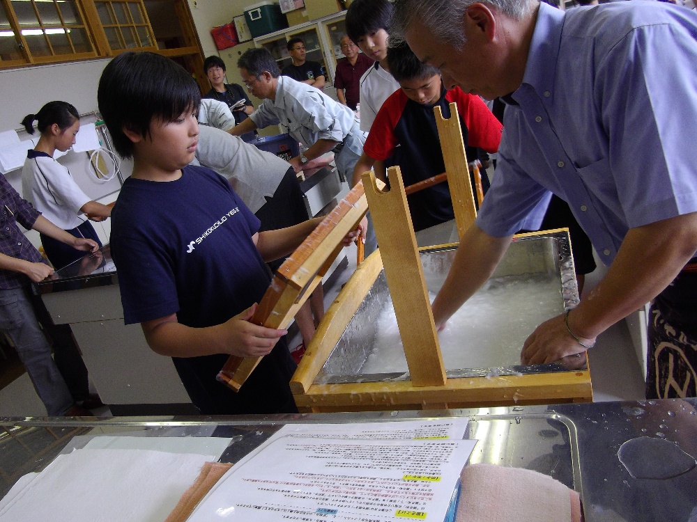 紙漉きを指導したのは当時愛媛県四国中央市「紙のまち資料館」館長の金崎峰萃氏。